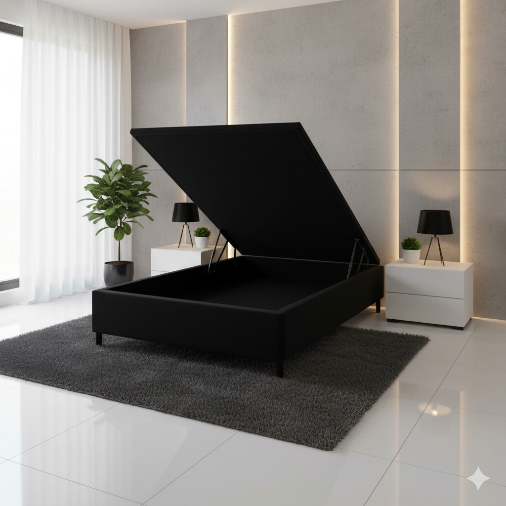 A Base Box Baú da Bio Flex une funcionalidade, design e organização em um único produto. Com acabamento em corino preto, o modelo possui visual elegante e fácil de combinar com diversos estilos de quarto. Sua estrutura é fabricada em madeira de reflorestamento, garantindo resistência e responsabilidade ambiental.